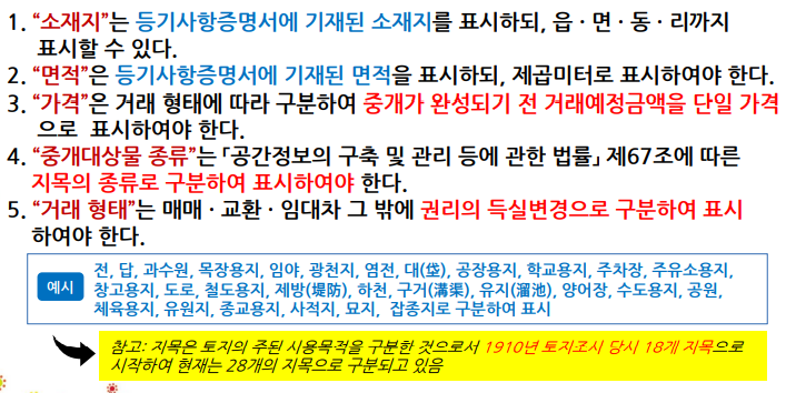 법 제18조의2제2항에 따라 개업 공인중개사가 토지에 관한 인터넷 표시 · 광고를 할 때에 명시하여야 하는 사항은 다음 각 호와 같다