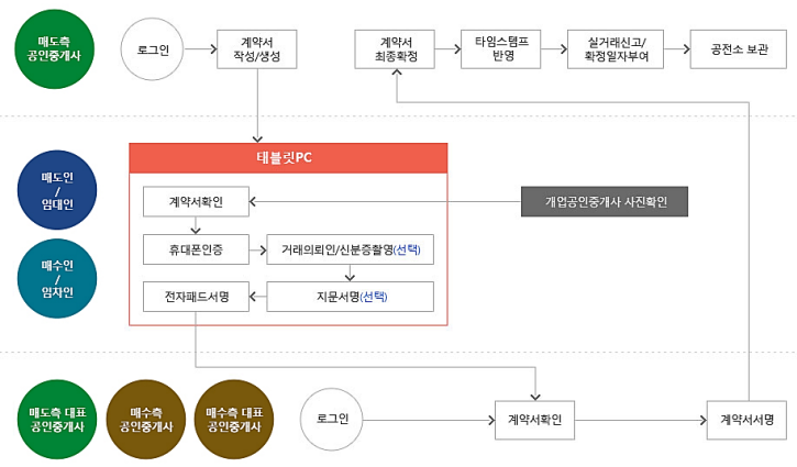 • 공인전자서명 : 거래당사자의 서명이 완료되면 개업공인중개사는 PC를 이용하여 부동산거래 전자계약 시스템에 로그인 후 공인전자서명을 함