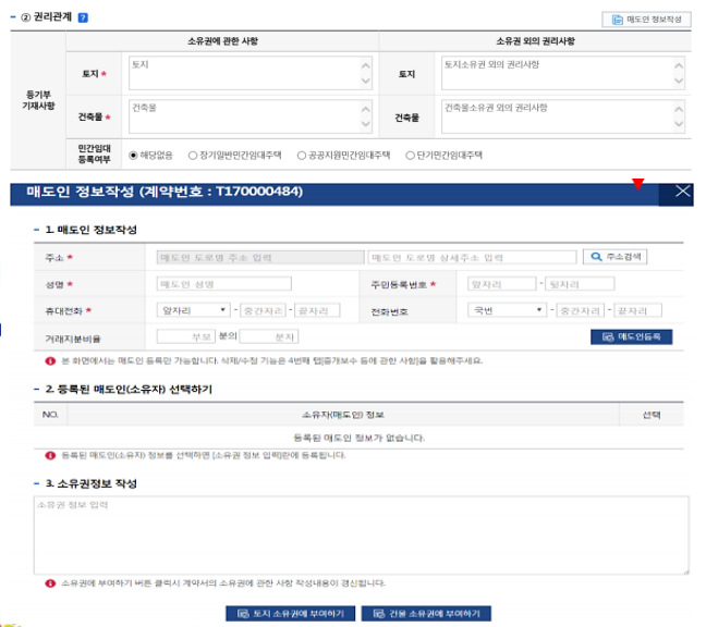 + 입력한 매도인 정보는 토지,건물 소유권에 부여하기 버튼을 이용하여 계약서에 내용을 반영함