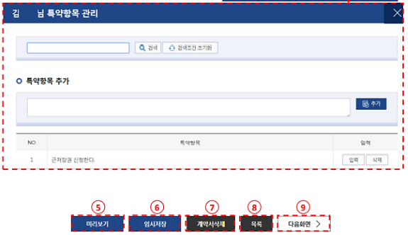 + 특약사항입력항목이 없는 경우 특약사항 추가하기 버튼을 이용하여 특약사항을 직접 입력하여 저장