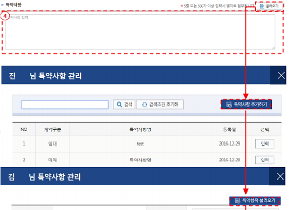+ 기 입력된 특약사항이 있는 경우 입력버튼을 이용하여 특약사항내용을 반영함