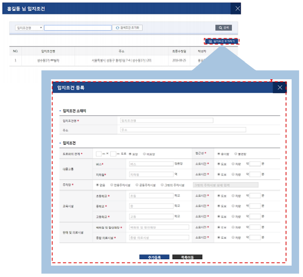 + 공인중개사는 입지조건, 주소명을 기준으로 자주쓰는 입지조건을 등록하여 사용할 수 있음