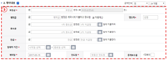 + 임대차 계약의 경우 임대차 기간 선택 후 상단 개월 선택에 따라 월/년 단위 임대차 기간이 자동계산됨