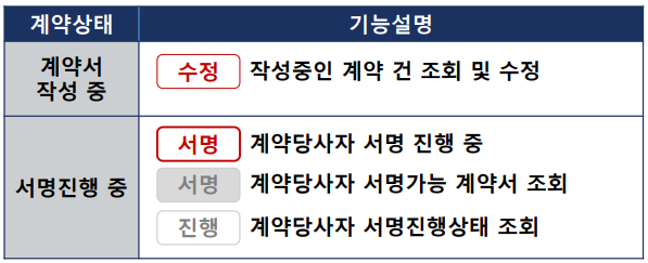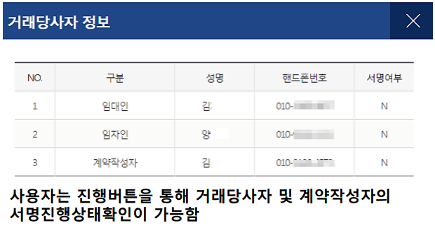 사용자는 진행버튼을 통해 거래당사자 및 계약작성자의 서명진행상태확인이 가능함