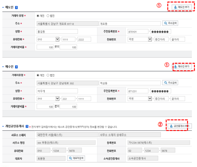 ① 거래당사자가 다수인경우 추가버튼을 통해 사용자 추가를 함(수기입력가능)