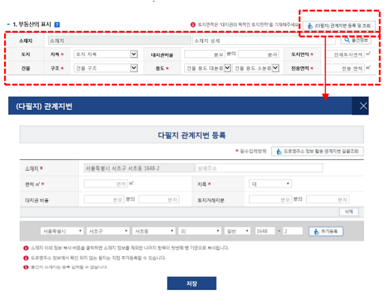 + 물건지에 관련지번이 있는 경우 지번/도로명주소 검색을 통해 추가입력