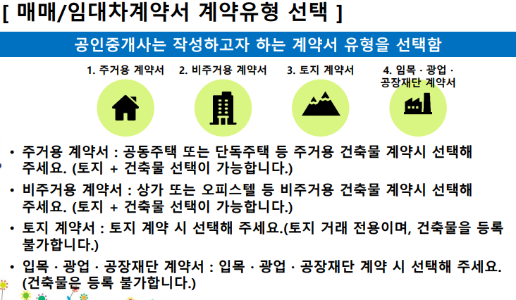 • 주거용 계약서 : 공동주택 또는 단독주택 등 주거용 건축물 계약시 선택해 주세요. (토지 + 건축물 선택이 가능합니다.) • 비주거용 계약서 : 상가 또는 오피스텔 등 비주거용 건축물 계약시 선택해 주세요. (토지 + 건축물 선택이 가능합니다.) • 토지 계약서 : 토지 계약 시 선택해 주세요.(토지 거래 전용이며, 건축물을 등록 불가합니다.)