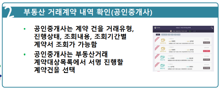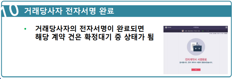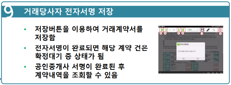 공인중개사는 모바일앱 또는 부동산거래 전자계약시스템(https://irts.molit.go.kr)에서 거래당사자간 거래내역을 최종확인 후 전자서명을 진행함