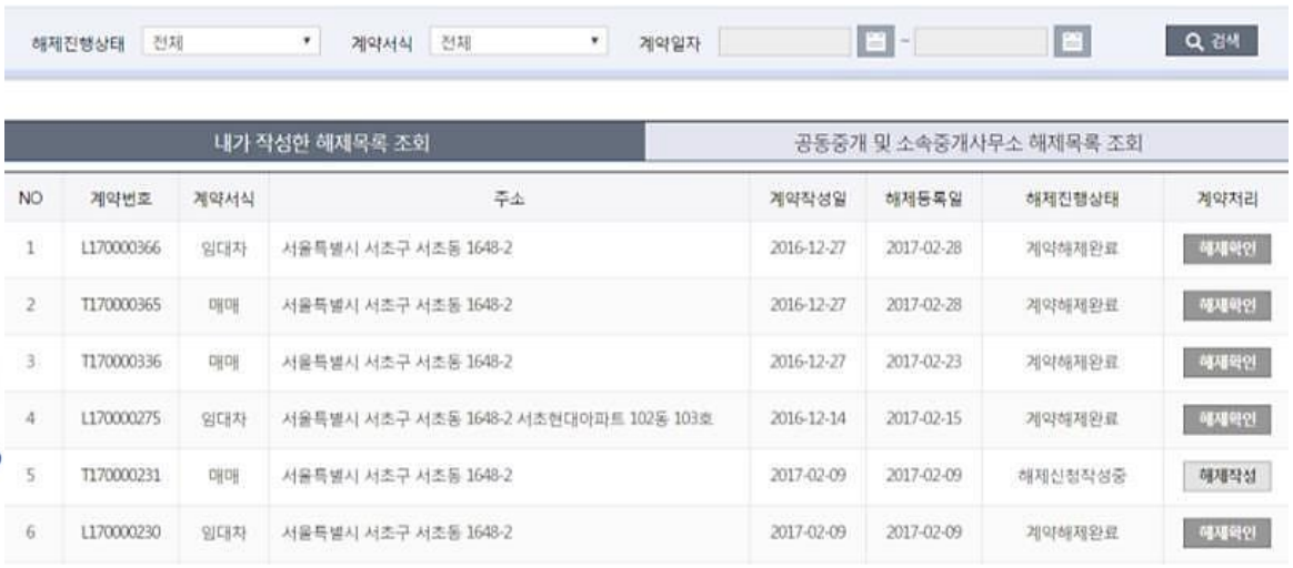 • 공인중개사는 매매/임대차계약 조회목록에서 완료된 계약건에 대해 해제신청을 함