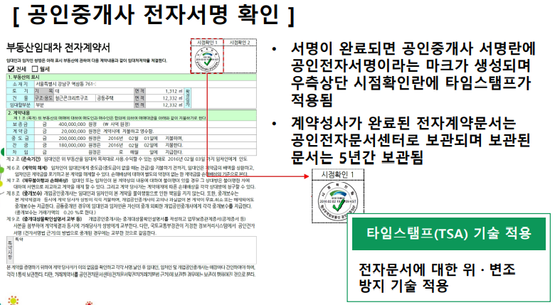 개인정보를 포함한 계약정보는 암호화해서 국가승인 공인전자문서보관센터에 안전하게 보관되며, 거래당사자는 보존기간(5년) 동안 전자계약시스템을 통해 언제든지 계약서를 확인할 수 있습니다. 또한 전자계약시스템은 안전한 거래를 위해 공인중개사 회원이 회원가입을 하려는 경우, 시·군·구청에 자격신고 및 등록여부 등을 사전에 확인하고 있습니다.