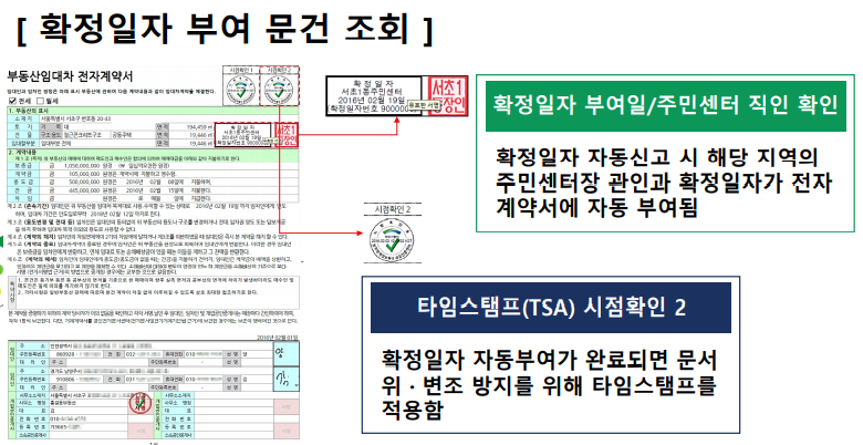 전월세계약서에서 “시점확인 2” 부분에 “시점확인필“ 마크가 없는 경우가 있으나, 이는 아직 확정일자 번호가 부여되지 않았음을 의미하는 것일 뿐 계약서 효력에는 영향이 없습니다.