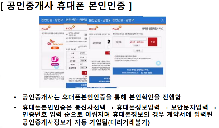 네, 그렇습니다. 부동산거래의 안전성 확보를 위해 거래당사자 본인확인 및 인증을 반드시 거치도록 하고 있으며, 현재 주된 본인인증 방법으로 본인명의 휴대전화 인증 방식을 취하고 있습니다. 향후 다양한 방법으로 본인인증을 할 수 있도록 시스템을 개선할 예정입니다.