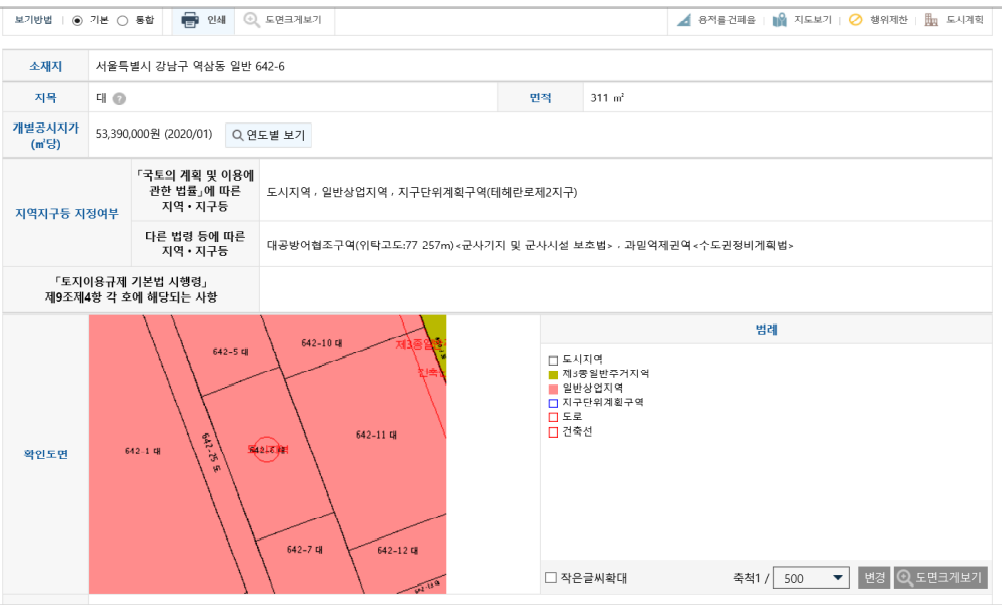 지목 / 면적 / 개별 공시지가 / 지역지구 지정여부 / 도면 / 축척