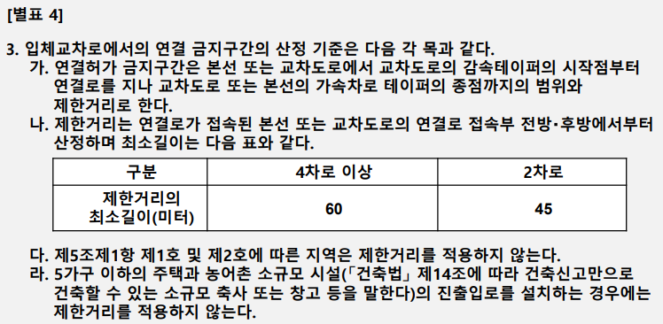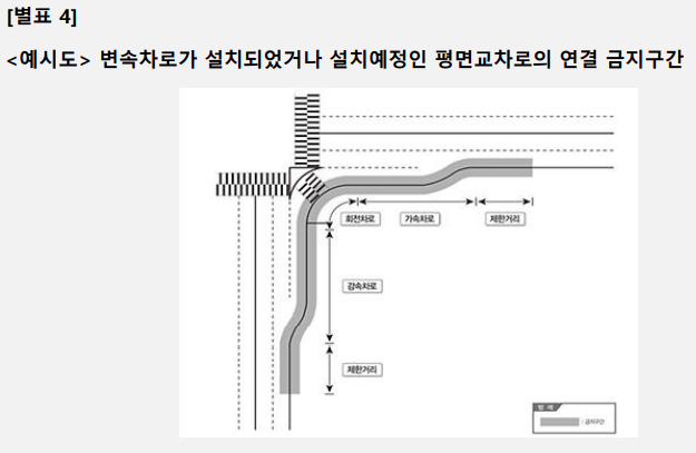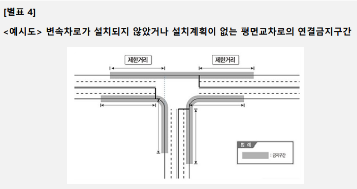 3. 도로와 다음 각 목의 어느 하나에 해당하는 도로를 연결하는 교차로에 대하여 별표 4의 연결 금지구간 기준에서 정한 금지구간 이내의 구간 및 별표 4의 2의 교차로 주변의 변속차로등의 설치제한거리 이내의 구간