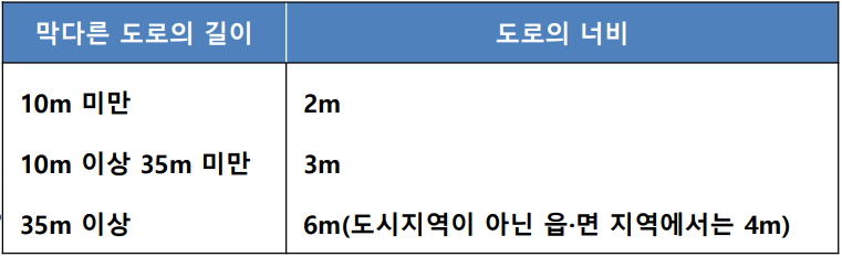 • 지형적 조건으로 자동차통행이 불가능한 경우와 막다른 도로의 경우에는 대통령령이 정하는 다음의 구조 및 너비의 도로를 말함