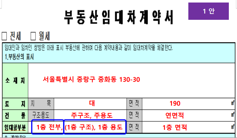 건물 구조·용도에 전체를 적기도 하고, 임대할 부분의 구조·용도를 적기도 한다