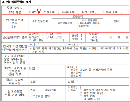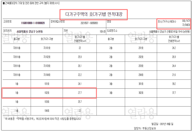 - 한 층 여러 가구 : 복도, 계단, 현관 등 공용부분 제외 각 세대 만 사용하는 면적을 개략 기재