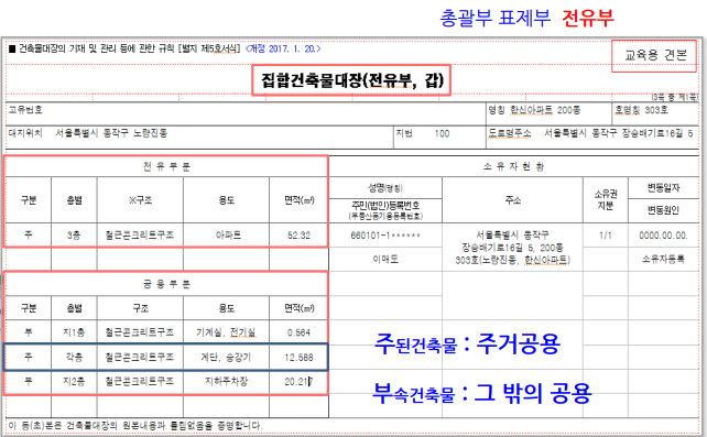 전용/ 공용면적 확인 : 집합건축물 대장 (전유부)