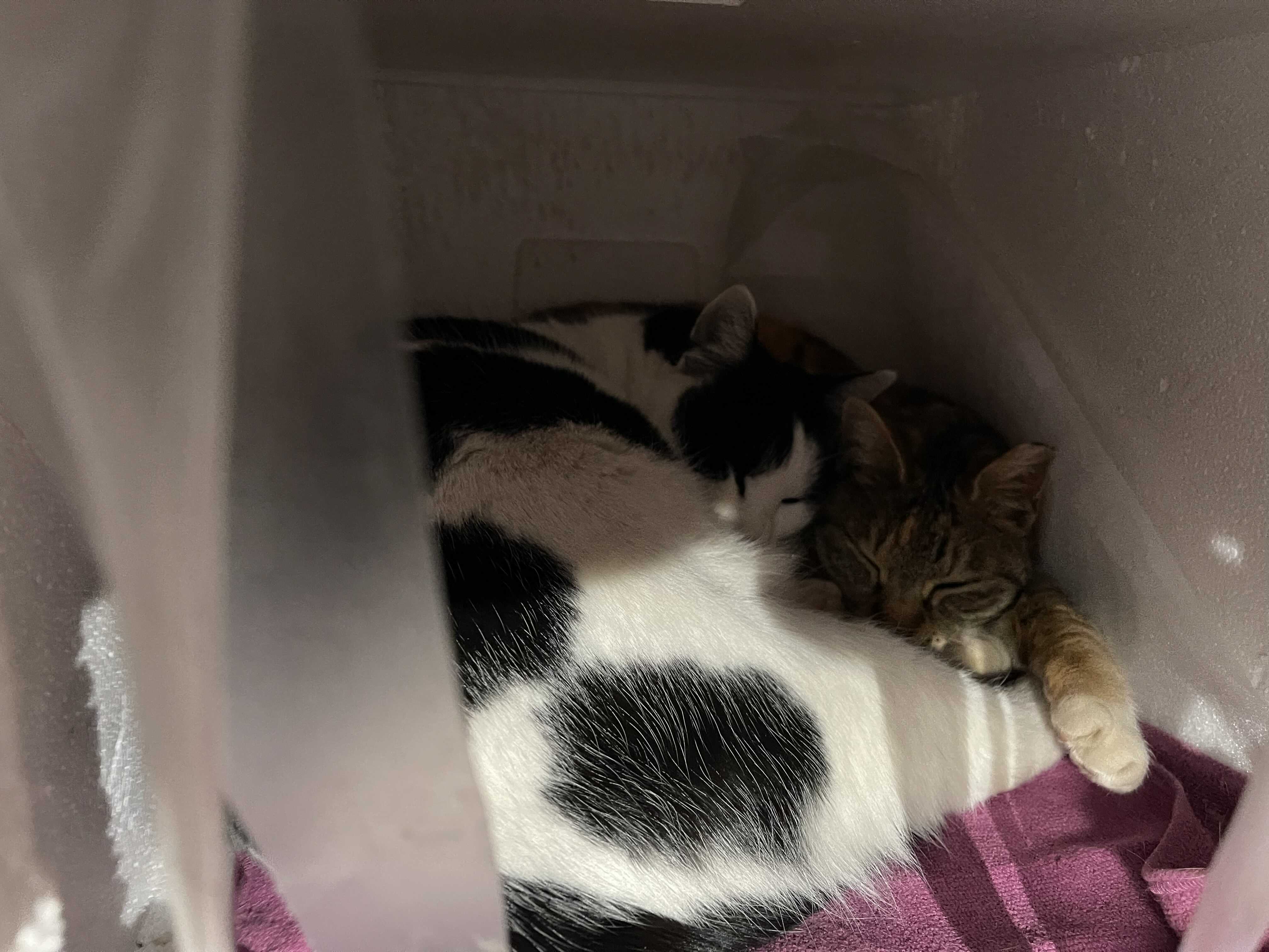 두 고양이가 서로 안고 따뜻하게 자고 있습니다