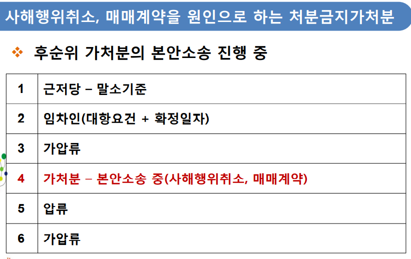 → 이러한 조치가 없는 한 사해행위취소의 가처분이 있는 경매물건의 경우에도 당해 가처분이 말소기준권리보다 후순위인 경우에는 원칙적으로 입찰을 받아도 좋을 것이다