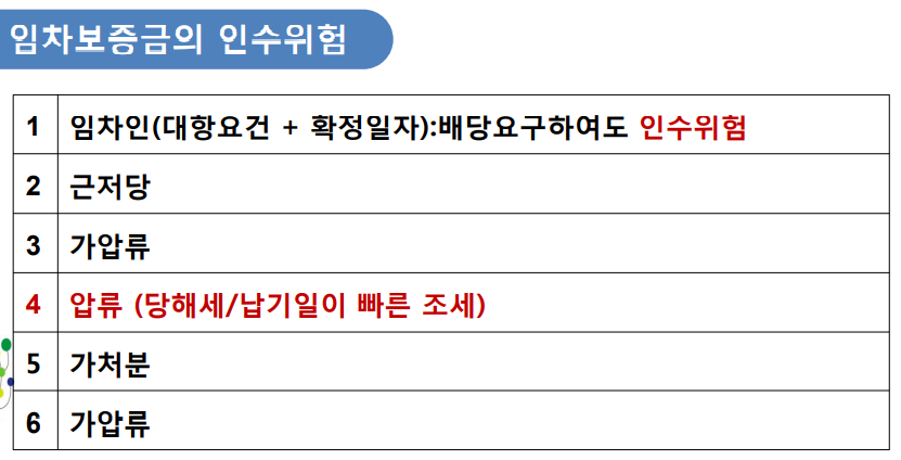 말소기준권리보다 선순위의 대항력이 있는 임차인과 당해세 또는 납기일(법정기일)이 빠른 당해세 이외의 조세압류가 있는 물건에 조세압류의 체납액이 매우 큰 경우, 조세압류가 선순위로 배당받으므로 임차인의 보증금의 전부 또는 일부에 대하여 매수인이 인수하는 경우가 발생할 수도 있다