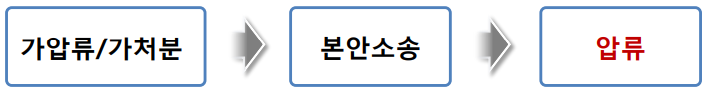 2. 좁은 의미에서 금전채권에 관하여 강제집행의 제1단계로써 집행기관이 먼저 채무자의 재산(물건 또는 권리)의 사실상 또는 법률상의 처분을 금지하고 이를 확보하는 강제행위를 말하는데, 민사집행법, 민사소송법 및 국세징수법에서의 압류는 본안의 소를 의미하는 본안판결 후의 법률적인 효력을 부여한다.